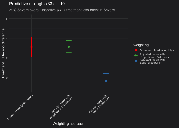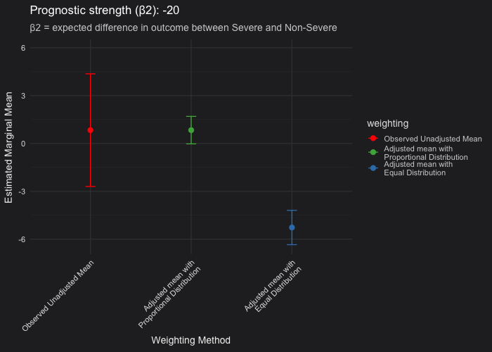 Proportional vs. equal weighting (green vs blue): When severity is strongly prognostic, the equal-weighting LSMs (which assume a 50/50 Severe and Non-Severe distribution) become negatively biased, showing a worse mean outcome (where a lower value indicates worse performance) compared to the unadjusted and proportional means. This pattern appears under the assumption that only 20% of patients are Severe in the population. In addition, you may observe that the confidence intervals are broader when using equal weighting than when using proportional weighting. Without going into the math, this happens because the weighting applied to the variance of the coefficient estimates also changes. Equal weighting gives more influence to underrepresented subgroups, making the estimated marginal mean less efficient and leading to wider confidence intervals.